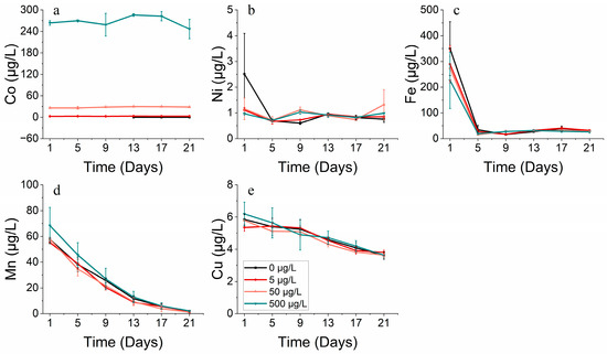 Concerning metal absorption, cobalt and nickel exhibited a correlation with iron, manganese, and copper. The coupling of Mn and Co can result from either Co scavenging by Mn oxides or the simultaneous co-oxidation of these elements via a common pathway [46,47,48]. The formation of Mn oxides can also lead to the scavenging of Ni and other bioactive trace metals [49,50]. The differences in cobalt concentrations affected the rate at which phytoplankton took up other metals, with increased cobalt levels aiding iron uptake and heightened nickel concentrations impeding the iron uptake by S. costatum. Manganese uptake by S. costatum was determined to be higher throughout the entire incubation period, in contrast with the rapid reduction in iron during the initial phase of incubation.