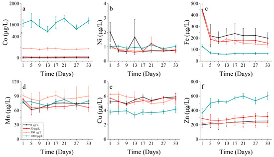 Metal concentrations of (a) cobalt, (b) nickel, (c) iron, (d) manganese, (e) copper and (f) zinc on P. donghaiense in different concentrations of cobalt.