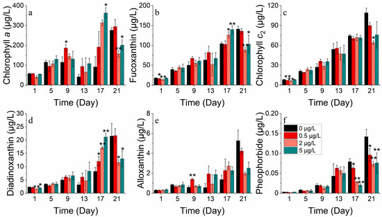 Pigment concentrations of (a) chlorophyll a, (b) fucoxanthin, (c) chlorophyll c2, (d) diadinoxanthin, (e) alloxanthin and (f) pheophorbide at S. costatum for different concentrations of cobalt. * indicates a significant difference between the experimental addition group and control group on the same day (p < 0.05); ** indicates a highly significant difference between the experimental additional group and the control group on the same day (p < 0.01).