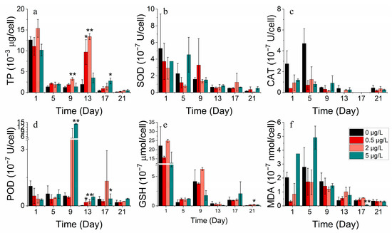 Enzyme concentrations of (a) TP, (b) SOD, (c) CAT, (d) POD, (e) GSH and (f) MDA on S. costatum in different concentrations of cobalt. * and ** indicate significant and highly significant differences between the experimental addition group and the control group on the same day, respectively (p < 0.05, p < 0.01).