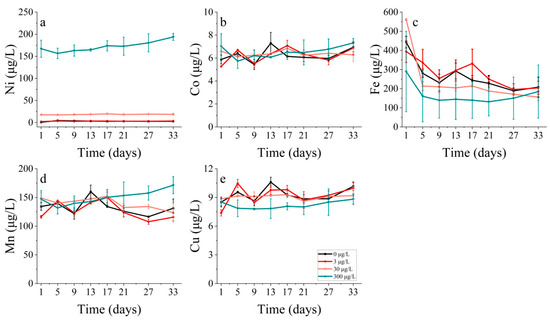 The Fe concentrations in S. costatum displayed a positive correlation with increasing nickel concentrations. By contrast, the relationship between the Ni concentration and Fe concentration in P. donghaiense was more intricate. Specifically, the lowest Fe concentration was observed with the highest Ni concentration (300 μg/L) addition treatment, and the remaining three treatments showed a gradual decrease in Fe concentration over 5 days, with the highest Fe concentration observed for the 30 μg/L group (Figure 16c). There seemed to be no discernible trend in the uptake of Mn and Cu by P. donghaiense under the different treatments (Figure 16d,e).