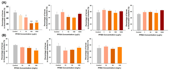 (A) Phototactic response of zebrafish larvae exposed to PFOS, PFOA, PFBS, and PFBA at concentrations of 1, 10, 100, and 1000 μg/L. (B) Phototactic response of zebrafish larvae exposed to PFOA, PFBS, and PFBA at 10, 50, and 100 mg/L. Statistical significance was denoted by * p < 0.05, *** p < 0.001.
