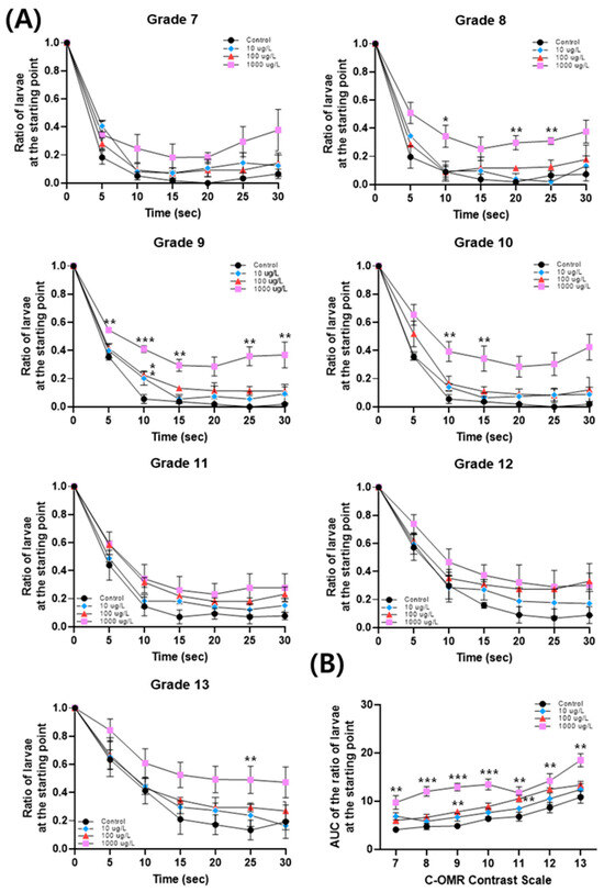 (A) The ratio of larvae at the starting point curve after exposure to PFOS at 10, 100, and 1000 μg/L. (B) The area under the curve (AUC) of the ratio of larvae at the starting point after exposure to PFOS at 10, 100, and 1000 μg/L. Significance was denoted by * p < 0.05, ** p < 0.01, and *** p < 0.001.