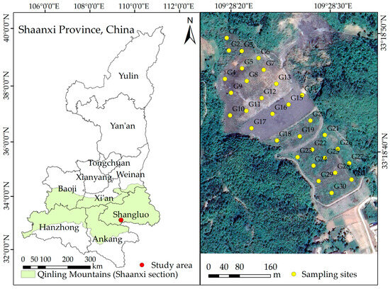 The gold mine tailings pond is located in the Qinba Mountain area at the southern foot of the Qinling Mountains at the southwest of Shangluo City, Shaanxi Province, China (Figure 1). It is located in the South Qinling Indo-Branch Fold Belt of the Qinling Stratigraphic Fold System. The regional climate is subtropical monsoon, with a mean annual temperature of 12.2 °C, and a mean annual rainfall of 804.8 mm. The tailings pond was put into operation in 1993, and it ceased to be used after a dam failure occurred in the 2006 expansion. Due to the long-term abandonment of the tailings, the residue left behind poses a serious threat to humans and the surrounding environment. It has been identified as one of the heavy metal control areas in China. The study area’s soil type is mainly cinnamon soil, and the regional topography is highly variable, with terrain generally high in the northwest and low in the southeast. Arsenopyrite and toxic sand are the principal gold-bearing minerals in the area, and gold has a close correlation with S and particularly with As. Annual and perennial herbs and a few dwarf shrubs are the main vegetation types in the area.