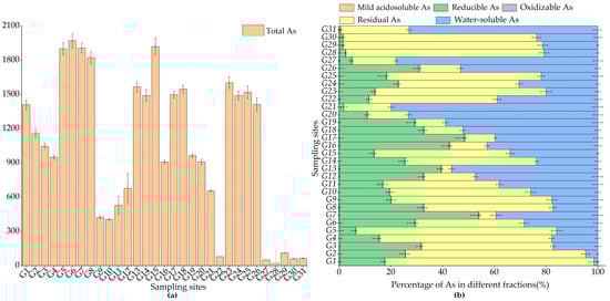 Distribution of total As (a) and the proportion of different speciations of As (b) in the studied soil.