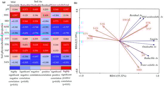 Correlation analysis (a) and RDA analysis (b) of soil As and physicochemical properties. (In Figure 4b, red arrows represent soil physicochemical properties and blue arrows represent soil As characteristics).