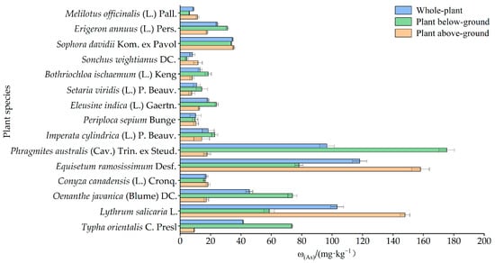 Distribution of As contents in the whole, above-ground, and below-ground parts of pioneer plants.