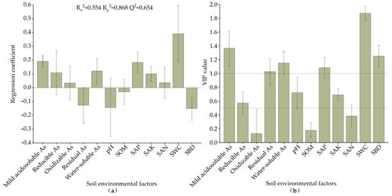 In the PLSR method analysis, both R2 and Q2 exceeded 0.5, indicating a satisfactory model fit. When the Q2 regression line’s intersection with the vertical axis is negative after 200 substitution tests, there is no overfitting of the model and the model is considered verified. The regression results make it possible to find the regression coefficient and the independent variable projected importance index (VIP values), which can intuitively reflect the role of soil environmental factors on the effect of plant As content. From Figure 6a, mild acidosoluble As, reducible As, oxidizable As, water-soluble As, SAP, SAK, SAN, and SWC were positively correlated with the As contents in the studied plants, and the rest of the variables were negatively correlated with them. As shown in Figure 6b, the VIP values, in descending order, were SWC, mild acidosoluble As, SBD, water-soluble As, SAP, residual As, pH, SAK, reducible As, SAN, SOM, and oxidizable As. The mild acidosoluble As, water-soluble As, residual As, SAP, SWC, and SBD had VIP values greater than 1, indicating that they were the main influences on the As content absorbed by plants. The reducible As, pH, and SAK had VIP values greater than 0.5, indicating that they were significant influences. The VIP values of the remaining variables were smaller than 0.5, indicating that they had a minor role in influencing As enrichment by plants.