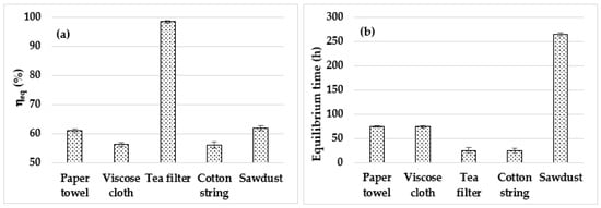 The calculus for ηeq was carried out with absorbance values instead of BAC concentrations because not all adsorbents have negligible A262 values in aqueous media, see sawdust, for example. The first four adsorbents in Table 1 do not add to the overall absorbance value at 262 nm, and the A values in Equation (1) are only due to the presence of BAC. Hence, the corresponding ηeq values of these adsorbents in Figure 2a are pertinent.