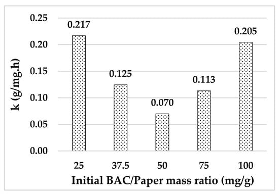 The experiments carried out at a constant 25 °C and variable initial BAC/paper mass ratio generated the rate coefficient values presented in Figure 5. It shows that the overall adsorption process is favored by both low and high ratios. At low ones, the adsorption might be favored by the large number of available empty sorption sites, thus occurring faster. On the other hand, at high mass ratios, the concentration gradient of BAC between the liquid bulk phase and the adsorbent’s surface increases, favoring diffusion, hence raising the overall rate constant.