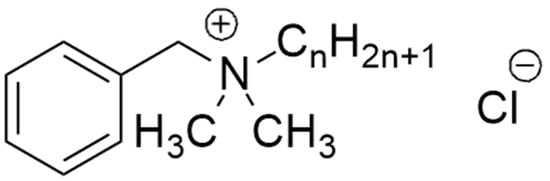 - Benzalkonium Chloride 50%, Safety Data Sheet; Fisher Scientific Company: Fair Lawn, NJ, USA, 2021; pp. 2, 5–6.