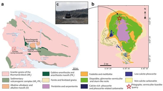 Locations of experimental sites of industrial barren land and the source of serpentine materials: (a) geological scheme of Kola Peninsula; (b) simplified geological map of the Kovdor massif (after Afanasyev and Pan’shin, with modification from []); reprinted from [] under the Creative Commons Attribution (CC BY) license 4.0; (c) phlogopite quarry (photo by authors).