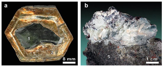Phlogopite (1) relics in the core of hexagonal-shaped plates of vermiculite (2) (a). Lizardite-1T (3) pseudomorph after phlogopite with annite (4) from serpentinized forsterite–diopside–phlogopite rock (5) from the vermiculite complex rocks of Kovdor massif (b).