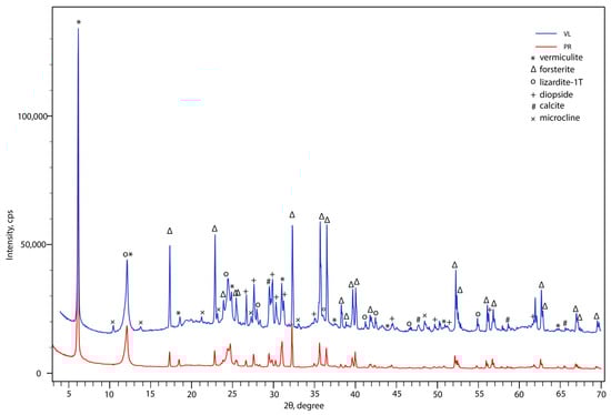 Powder XRD pattern of pyroxenite product (PR—red curve) and vermiculite–lizardite product (VL—blue curve).