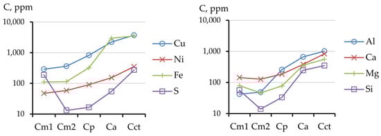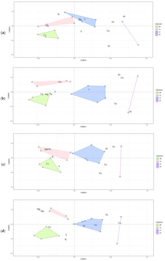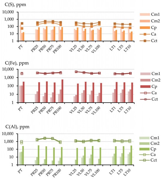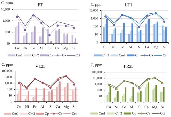 The fractional analysis data were processed using mathematical statistics methods []; the ordination of the samples is shown in Figure 15. The general trend for all fractions was the isolation of a group of metals (Cu, Ni, Fe, and Al). Samples of the LT series and the original peat were confined to one area. Another isolated group was Ca, Mg, and Si—the main components of serpentine materials. Manganese and sulfur were in an intermediate position between two groups of elements mentioned above. The samples in the PR series tend toward the calcium group, whereas the VL samples were divided between the PR and LT soil mixtures. Thus, based on these data, successive series of both experimental options (PT, LT, VL, PR) and groups of elements: (Cu, Ni, Fe, Al), (Mn, S), and (Ca, Mg, Si) were compiled.