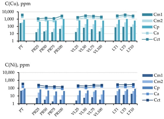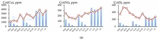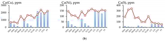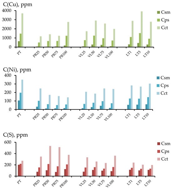 The nickel content in the conditional total fraction in all soil mixtures in the experiments with non-activated serpentinites PT and VL also exceeded the calculated values. The copper contents in experiments PT25 and VL25 were lower than the calculated values. The same tendencies were observed for the inert fraction. For copper, nickel, and sulfur, the inert fraction contributed the most to the conditional total content.