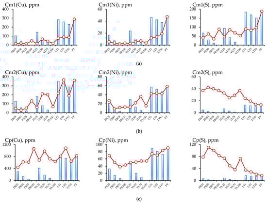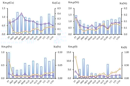 For copper, the same pattern for the third coefficient, the ratio of the conditionally total content to the total concentration (the total migration coefficient, Ks), was observed (Figure 10). Like copper, the Ks for sulfur was higher in the PR series, whereas a marked decrease in the Ks for iron was noted.