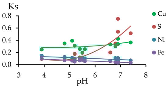The relationship between the Ks and the values of the actual acidity of the soil mixtures is shown in Figure 12. As the pH increased, the total migration coefficient Ks decreased for Ni and Fe and increased for Cu and especially for S.
