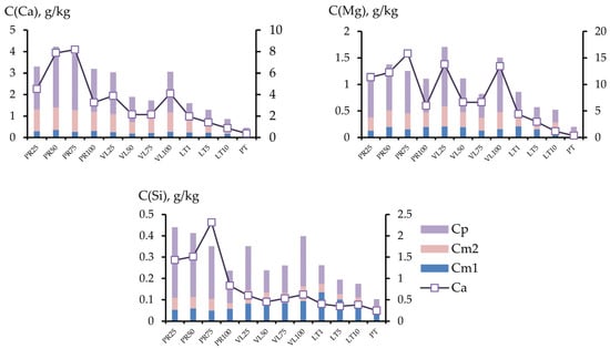 Copper, as a rule, is fixed on alkaline barriers, whereas nickel forms poorly soluble silicates []. The fractional composition of Si, Ca, and Mg in the soil mixtures is shown in Figure 13. The sum of the mobile calcium fractions in the PR series varied in the range of 3.2–4.2 g/kg, and 1.8 to 3.1 g/kg in the VL series, and was less than 1 g/kg in the LT series. The distribution of mobile magnesium and silicon in the PR and VL series was more uniform. The content of the acid-soluble fraction contrasted that of calcium and silicon; the PR series could be distinguished according to the contents of these elements.
