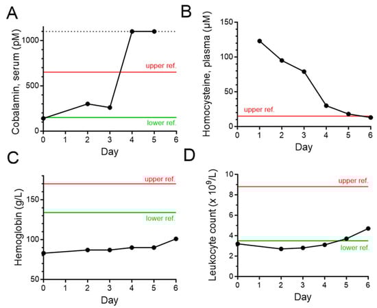 Clinical chemistry dynamics during the first week of admission. Day 0 represents the arrival to the emergency room and the time course (black) shows the evolution during the initial hospitalization. Green and red lines represent lower and upper reference intervals. The dotted line represents the maximum analysed concentration. (A) Serum cobalamin analysis does not differentiate between functional cobalamin and oxidized cobalamin. Thus, the value of 140 pmol/L likely underestimates the true level of cobalamin deficiency on presentation. (B) Plasma homocysteine was 123 µmol/L on day 1, indicating a severe impairment of the methionine cycle. (C) The patient was anaemic on presentation, with haemoglobin of 83 g/L. The anaemia was microcytic (mean corpuscular volume, 71 fL; reference, 82–98 fL) and ferritin was low (3 µg/L; reference, 30–400 µg/L), suggesting iron deficiency. The patient was treated with oral iron sulphate tablets. It is possible that bone marrow dysfunction caused by N2O contributed to the anaemia (see (D)). (D) The leukocyte count was low on arrival and normalized in 5 days. This may have been due to bone marrow dysfunction caused by N2O. The patient had a normal thrombocyte count.