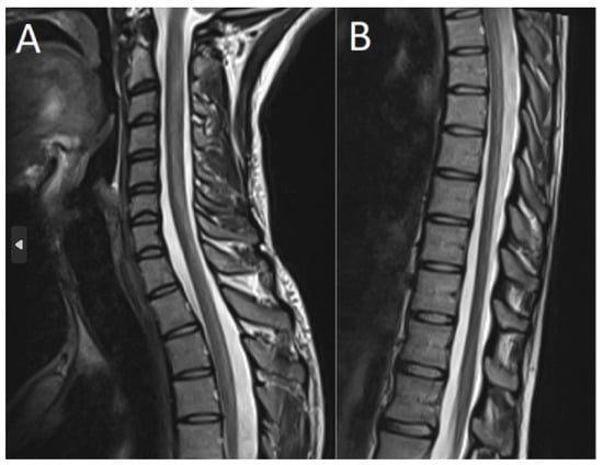 T2-weighted contrast-enhanced spine MRI shows subacute combined degeneration. Contrast enhancement was observed in the cervical (A) and thoracic (B) spinal cord. Investigations were performed two days after admission.