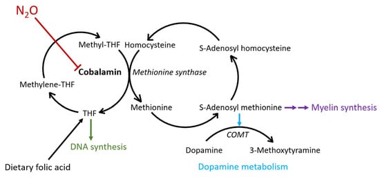 The patient in the present case displayed symptoms associated with a hyperdopaminergic state, including dystonic posturing and athetosis, symptoms that have also been reported in a limited number of prior patients with cobalamin neuropathy [,]. Since one pathway of dopamine degradation is via the SAM-dependent enzyme catechol-O-methyltransferase (COMT), we hypothesize that N2O-induced hyperkinetic symptoms may be caused by COMT dysfunction secondary to depleted levels of SAM (see Figure 3) [].