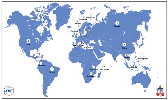 The selected studies, according to the inclusion/exclusion criteria, were performed in 19 countries (Figure 2), most of them in Brazil (seven), which is expected since it is one of the five countries that most emit mercury into the air and the third in emissions from ASGM according to the United Nations Environment Programme []. Interestingly, most studies involved the traditional populations of the Tapajós River basin, the region with the highest density of ASGM in the Amazon [,]. Currently, the Amazon is one of the largest global contributors to the emissions of mercury into the atmosphere. About 80% of all emissions from South America originate from this region []. It is estimated that more than 200 tons of mercury are released annually from the Amazon, although this quantity could be greatly underestimated [,]. As with many populations in the Amazon, the majority of residents in the Tapajós River basin are vulnerable populations who are located in remote regions with limited access to healthcare and higher education []. Amazonian populations usually show a trihybrid ancestry with three major contributors (Amerindian, European and African), with European origin having the highest contribution [,,]. Interestingly, a significant higher Amerindian contribution has been recently associated with a higher susceptibility to mercury []. This is a relevant fact, indicating that more studies on populations from the Southern Hemisphere and their characteristics are needed. Although the countries that most emit mercury from ASGM (Indonesia, Perú and Brazil) are located in the Southern Hemisphere [], our current knowledge about human exposure and intoxication is mainly from cohorts from developed countries, such as NHANES (USA), ALSPAC (UK) or REGARDS (USA). Especially worrying is the low number of studies from the sub-Saharan region, despite this region accounting for 16% of the global emissions of mercury (with up to 80% due to ASGM). In this study, we found only one study with populations from Africa (Tanzania and Zimbabwe) and only two with populations from Asia (Thailand, Philippines and Indonesia). Only three studies included populations of more than one country: Austria and Slovakia [], Slovenia and Croatia [], and the Philippines, Indonesia, Tanzania and Zimbabwe []. However, these studies did not analyze the ancestry, which would be highly recommended, especially for the latter study by Kolbinger et al. (2019), which included populations from three different continents [].