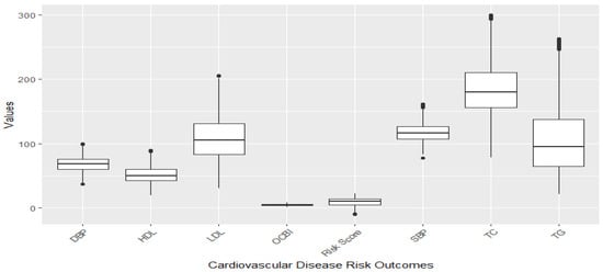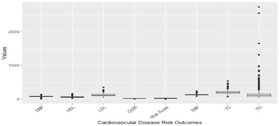 Figure 1 illustrates a boxplot showing the distribution of the cardiovascular disease risk outcome before removing outliers, and Figure 2 shows the distribution after removing outliers. The study used a 1.5 threshold rule to multiply the interquartile range (IQR). Then, the product was subtracted from the lower boundary to determine the lower limit, and the product was added to the upper boundary to set the upper limit. Figure 1 shows significant outliers with TG, TC, and LDL. Figure 2 gives a better understanding of the distribution of these risk outcomes after removing the outliers.