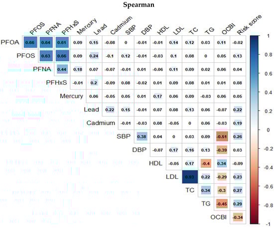 Spearman correlation between pairs of PFASs, metals, and cardiovascular-related variables.