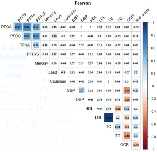 Descriptive statistics were calculated to describe the distribution of PFASs and metals, demographic variables, and CVD-related variables. Both Spearman and Pearson correlations were used to assess the relationships among the study variables. To test for differences between participants, the survey-weighted t-test was used for comparing means.