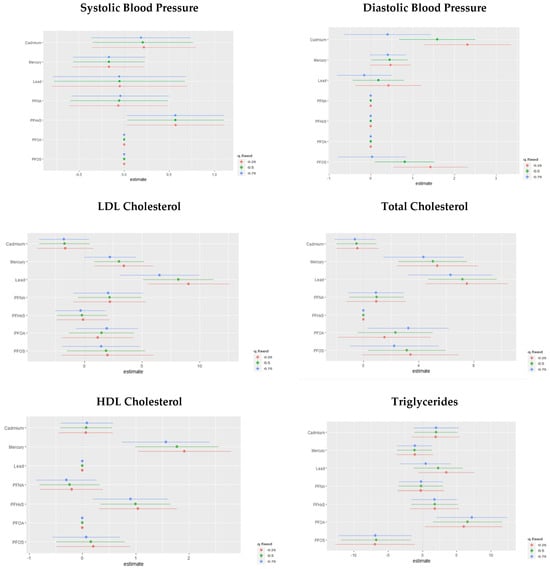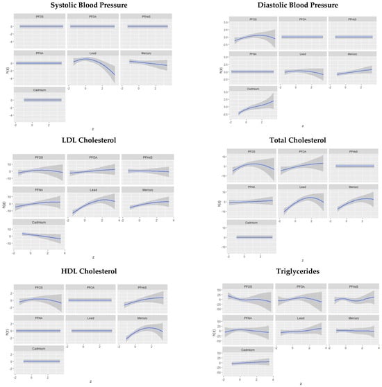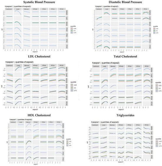 The BKMR modeling approach was employed to evaluate the collective impact of PFOA, PFOS, PFNA, PFHxS, Hg, Pb, and Cd on variables associated with cardiovascular health. BKMR is a method that has been widely utilized by numerous researchers to evaluate the combined effect of multiple pollutants [,,,,,] on a wide range of health outcomes due to its capacity to model non-linear and non-additive relationships effectively. This is because the technique is adept at capturing complex interactions and dependencies within the data [,] and, furthermore, offers a more precise evaluation of the combined impact of contaminants on a specific outcome of interest.