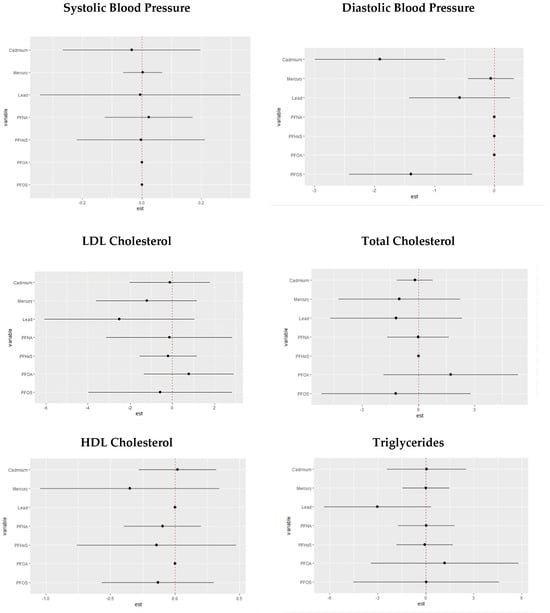 Numerous epidemiological studies have linked Pb exposure with CVDs such as peripheral arterial disease, coronary heart disease, and stroke [,,]. The mechanistic pathway of how chronic Pb exposure causes CVD is through promoting oxidative stress, limiting nitric oxide availability, impairing nitric oxide signaling, augmenting adrenergic activity, increasing endothelin production, altering the renin–angiotensin system, raising vasoconstrictor prostaglandins, lowering vasodilator prostaglandins, and promoting inflammation []. In recent cross-sectional studies using data from the National Health and Nutrition Examination Survey (NHANES), Cd exposure measured in urine and blood has been associated with cardiovascular outcomes such as stroke and heart failure [], myocardial infarction [], peripheral arterial disease [], and elevation in blood pressure []. Hg toxicity may be associated with hypertension and coronary heart disease in adults []. Recent studies have suggested that Hg is associated with cardiovascular dysfunction [,,,,]. Specifically, Hg exposure has been associated with elevated BMI, a larger waist circumference, and higher diastolic blood pressure, total cholesterol, and triglycerides [].