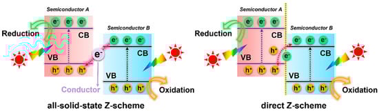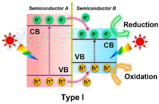 In a typical Type I heterojunction photocatalyst (Figure 1), the conduction band (CB) and valence band (VB) of semiconductor A situate above and below the corresponding bands of semiconductor B, respectively. Upon light irradiation, e− and h+ originating from semiconductor A transition to the CB and VB of semiconductor B, respectively.