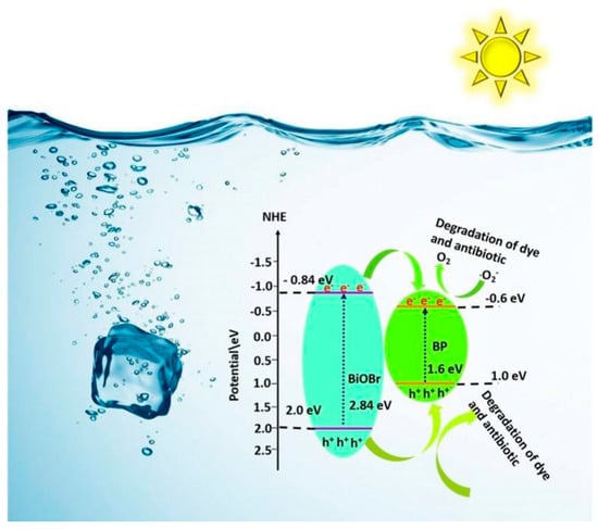 Li et al. employed a one-step co-precipitation approach to combine poly dimethyldiallyl ammonium chloride (PDDA)-passivated BPNS with BiOBr, resulting in the formation of BPNS–BiOBr heterojunctions []. Regarding the BPNS–BiOBr samples, their UV and visible-light absorption capabilities exhibited enhancement with the BPNS content increased, accompanied by a redshift in absorption edges. This outcome suggested that the introduction of BPNS extended the visible-light utilization of the photocatalytic system. Such enhancements were highly beneficial for improving the photocatalytic efficiency of the catalyst, leading to augmented photocatalytic activity and enhanced generation of photoinduced carriers. Hence, the BPNS–BiOBr heterojunctions demonstrated exceptional photocatalytic performance, achieving a remarkable 98.2% degradation efficiency for ciprofloxacin (CIP) within 60 min. The augmented photocatalytic activity observed in the heterojunctions could be ascribed to the successful establishment of a Type I bandgap configuration (Figure 2). Notably, the passivating influence of PDDA enabled the heterojunctions to uphold remarkable photostability, even through multiple degradation cycles.