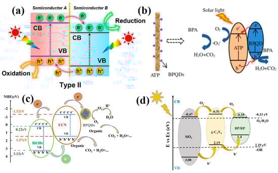 (a) Schematic illustrating the separation and migration of interface charge carriers under light irradiation in Type II heterojunction system. Copyright Year 2023, Separation and Purification Technology © Elsevier Pvt Ltd., Amsterdam, The Netherlands. (b) Photocatalytic degradation mechanism of BPQDs/ATP. Copyright Year 2017, Functional Materials Letters © World Scientific Publishing Company, Singapore. (c) The band structure diagram of tetracycline degradation and possible mechanisms. Copyright Year 2018, Polymers © Multidisciplinary Digital Publishing Institute, Basel, Switzerland. (d) The photocatalytic mechanism of BP/RP-g-C3N4/SiO2. Copyright Year 2023, RSC Advances © Royal Society of Chemistry, London, UK.
