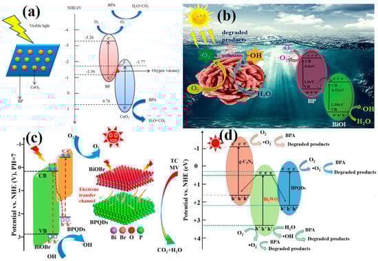 Bismuth-based oxide materials, characterized by their distinctive electronic structure, well-suited bandgap dimension, facile synthesis, cost-effectiveness, and readily available source materials, have garnered substantial interest in recent years [,]. They have been widely employed in the field of photocatalysis and exhibit substantial potential for various applications. In 2020, Jing and colleagues presented a novel visible-light-responsive photocatalyst consisting of PDDA-functionalized BP (F-BP) and BiOI with a direct Z-scheme alignment (Figure 6b) []. This photocatalyst exhibited remarkable efficiency in the degradation of methylene blue (MB) and TC. The direct Z-scheme heterojunction significantly enhanced the separation and transfer rates of e−–h+ between BP and BiOI, preserving the high redox capacity of the F-BP/BiOI heterojunction photocatalyst. As a result, the accumulated e− in the CB of BP exhibited substantial reducing power, effectively generating •O2− from O2, while the h+ in the VB of BiOI participated in reactions with H2O to form •OH. These newly generated ROS, characterized by strong oxidative capabilities, further oxidized pollutants. Consequently, the optimized F-BP/BiOI heterojunction photocatalyst displayed an outstanding photocatalytic performance, achieving removal efficiencies of 97.6% for MB and 90.0% for TC. In addition, the photocatalyst exhibits commendable stability even after three catalytic cycles. Furthermore, a direct Z-scheme photocatalytic system was successfully engineered by Yao et al. through the integration of BPQDs onto the surface of BiOBr thin film []. The optimized BPQDs/BiOBr-1 thin film exhibited a significantly enhanced photocatalytic activity for the degradation of methyl violet (MV) and TC, with efficiencies 3 and 3.65 times higher, respectively, compared to its pure BiOBr counterpart. Radical trapping experiments have determined that the active species involved in the reaction were h+, •O2−, and •OH. The formation of a direct Z-scheme photocatalytic system leaded to e− accumulation in the CB of BPQDs and h+ accumulation in the VB of BiOBr, promoting the generation of h+ and •O2−, thus accelerating the photocatalytic reaction (Figure 6c). Additionally, the enhanced efficiency of charge separation, improved visible-light absorption, and increased specific surface area also contributed to the enhanced photocatalytic performance of BPQDs/BiOBr. In addition, Du and colleagues developed a novel composite involving dual Z-scheme heterojunctions, combining Bi2WO6, g-C3N4, and BPQDs []. The Bi2WO6/g-C3N4/BPQDs was applied for the photocatalytic degradation of BPA under visible-light irradiation. By optimizing the mass ratio of g-C3N4 and BPQDs within the Bi2WO6/g-C3N4/BPQDs composites, the visible-light harvesting capacity could be significantly enhanced. This optimization leaded to improved charge separation efficiency. Consequently, the photocatalytic activity for BPA degradation was greatly enhanced, achieving an impressive degradation rate of 95.6% within 120 min for a 20 mg/L BPA solution. This performance surpassed that of individual components such as Bi2WO6 (63.7%), g-C3N4 (25.0%), BPQDs (8.5%), and Bi2WO6/g-C3N4 (79.6%) composite, highlighting the superiority of the Bi2WO6/g-C3N4/BPQDs composite system. Radical trapping experiments provided crucial insights, revealing that photogenerated h+ and •O2− played pivotal roles in the photocatalytic degradation of BPA (Figure 6d).