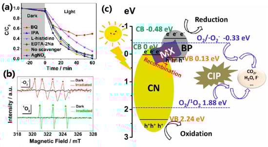 (a) Degradation (C/C0 plot) of CIP in photocatalysis, BQ, IPA, l-histidine, EDTA-2Na, and AgNO3 as scavengers, (b) ESR spectra of •O2− and 1O2, (c) band structure of the C0.2X0.01B0.01 samples for CIP photodegradation under visible light irradiation. Copyright Year 2021, Applied Catalysis B: Environmental © Elsevier Pvt Ltd., Amsterdam, The Netherlands.