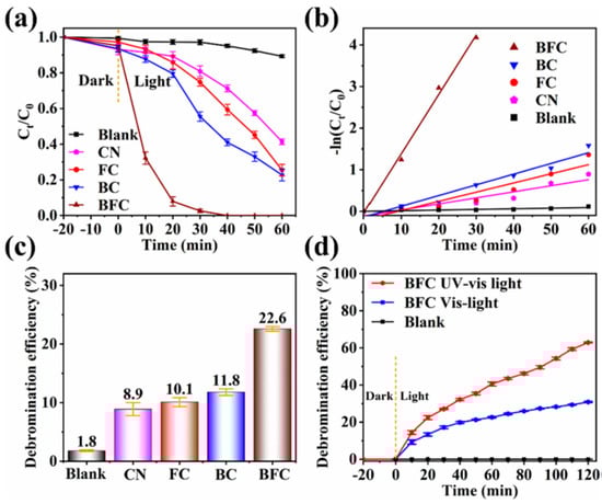 (a) Removal, (b) rate constant, and (c) debromination efficiency of TBBPA over different samples in 60 min under visible light irradiation, (d) debromination efficiency of the BFC under visible and UV–vis light irradiation. Blank: pure photolysis. Copyright Year 2023, Separation and Purification Technology © Elsevier Pvt Ltd., Amsterdam, The Netherlands.