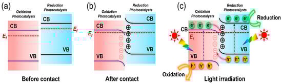 Charge transfer pathway in an S-scheme heterojunction photocatalyst: (a) before contact, (b) after contact, and (c) photogenerated charge carrier transfer under light irradiation. Copyright Year 2023, Separation and Purification Technology © Elsevier Pvt Ltd., Amsterdam, The Netherlands.
