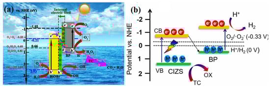(a) S-scheme photocatalytic charge transfer and reaction mechanism between BiOBr and BP. Copyright Year 2020, Journal of Hazardous Materials © Elsevier Pvt Ltd., Amsterdam, The Netherlands. (b) S-scheme photocatalytic charge transfer and reaction mechanism of BP/CIZS. Copyright Year 2022, Journal of Alloys and Compounds © Elsevier Pvt Ltd., Amsterdam, The Netherlands.