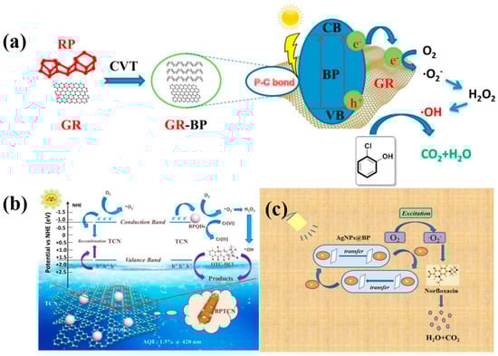 (a) The plausible mechanism of BP/GR hybrid for the degradation of 2-CP. Copyright Year 2019, Environmental Pollution © Elsevier Pvt Ltd., Amsterdam, The Netherlands. (b) Possible photocatalytic mechanism scheme of the carriers separation process on the interface of BPTCN under visible light irradiation. Copyright Year 2020, Applied Catalysis B: Environmental © Elsevier Pvt Ltd., Amsterdam, The Netherlands. (c) Possible photocatalytic mechanism of the carriers separation process on the interface of AgNPs@BP nanocomposite under near-infrared light irradiation. Copyright Year 2020, Solid State Sciences © Elsevier Pvt Ltd., Amsterdam, The Netherlands.