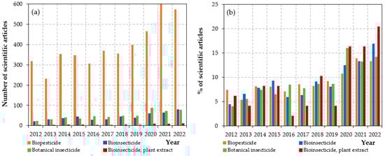 Graph showing the number of published literature articles (a) and their percentage in relation to the total number of articles (b) reporting data on “biopesticide” application versus those reporting data on “bioinsecticide/botanical insecticide/bioinsecticide; plant extract” application over the period of 2012–2022.
