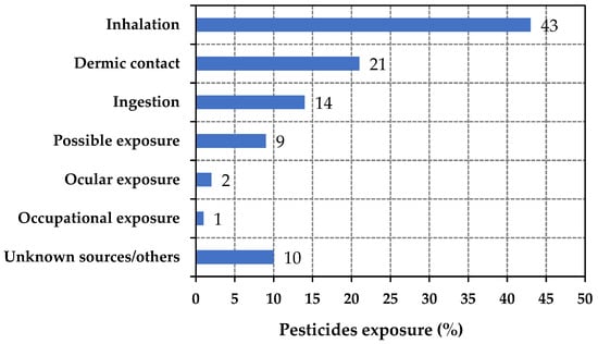 Different groups of people are affected by pesticide exposure, including workers in pesticide manufacturing plants, agricultural fields, household pest control, and greenhouses (e.g., applicators, mixer loaders, etc.). The highest likelihood of exposure to pesticides in the work area is at the time of production and formulation, as the risk is very high during this activity. In the production site, the likelihood of hazard is high because more hazardous chemicals and harmful solvents are being used [43]. In agriculture, farmers and professional applicators are frequently exposed to high levels of pesticides, resulting in the potential for adverse health effects [30,44]. It is predicted that the use of pesticides for pest control leads to an estimated 26 million poisonings globally in the human population each year, accounting for at least 3 million hospital admissions and 220,000 deaths [45]. Exposure to pesticides can cause health problems including cancer, diabetes, respiratory and neurological disorders, reproductive (sexual/genital) syndromes, and oxidative stress. All of the above conditions are linked to direct exposure, the handling of pesticides, or pesticide residues on food [46,47]. Figure 3 shows the distribution of pesticide exposure incidents reported to the U.S. National Pesticide Information Center (NPIC) in 2018, according exposure type. In 2018, a total of 2140 pesticide exposures were reported to the NPIC. Of these incidents, 43% were due to inhalation, while 21% were due to dermal/skin contact. Occupational and ocular exposure made up the lowest percentages (1–2%), while unknown sources were estimated at 10% [48].