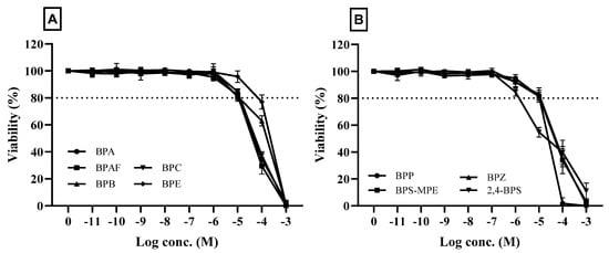Effects of test chemicals on the viability of cultured HeLa 9903 cells. Cell viability was assessed by MTT assays, and the results are presented as a percentage of the control group viability. Cells were treated with indicated concentrations for 24 h. The results represent the means of three separate experiments, and the bars represent the standard error. The dotted line in the figure represents a viability of 80%. The figure shows the cytotoxicity of the chemicals that showed positive results in the agonistic or antagonistic tests of estrogen receptor transactivation (n = 3). (A): Bisphenol A (BPA), Bisphenol AF (BPAF), Bisphenol B (BPB), Bisphenol C (BPC), and Bisphenol E (BPE); (B): Bisphenol P (BPP), Bisphenol S(BPS)-MPE, 2,4-dihydroydiphenyl sulfone (2,4-BPS), and Bisphenol Z (BPZ).