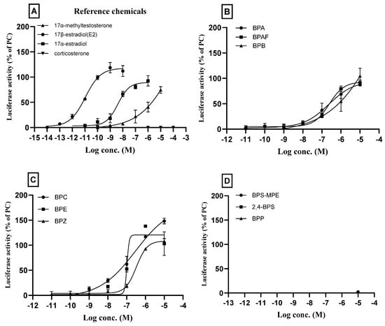 The estrogenic activities of BPA and its eight analogs were evaluated based on OECD TG 455. For the agonist assay of ERα transactivation in cultured HeLa 9903 cells, the reference chemicals 17β-estradiol, 17α-estradiol, and 17α-methyltestosterone and corticosterone were first tested. As shown in Figure 2A, concentration–response transactivation was induced by 17β-estradiol, 17α-estradiol, and 17α-methyltestosterone, with different potencies and efficacies. The results for the reference chemicals were very similar to those provided in the test guideline. When the cultured cells were treated with corticosterone, no sign of transactivation was observed in all the test concentrations, 10−10~10−4 M, as shown in TG 455. These results confirmed the validity of the performance criteria for the agonist assay in this study.