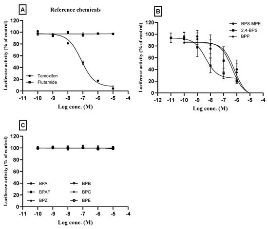 Antagonistic assay of bisphenol compounds for estrogenic receptor alpha (ERα) transcriptional activity in cultured HeLa 9903 cell line. The cells were incubated with different concentrations of bisphenol compounds based on the results of the cytotoxicity test, and an antagonistic assay was performed. For the antagonist assay, test wells were spiked with 25 pM 17β-estradiol. The normalized mean values of the luminescence signal (Luciferase activity) of the test wells were divided by that of the spiked-in control (100%) to obtain the relative transcriptional activity. (A): Tamoxifen (positive) and flutamide (negative) were used as the reference chemicals. (B): BPS-MPE, 2,4-BPS, and BPP showed positive antagonistic activity to the ERα transactivation. (C): BPA, BPAF, BPB, BPC, BPE, and BPZ did not show antagonistic activity to the 17β-estradiol-activated ERα transcription. Three separate experiments were performed in transactivation assay, and data were represented as mean ± standard error.