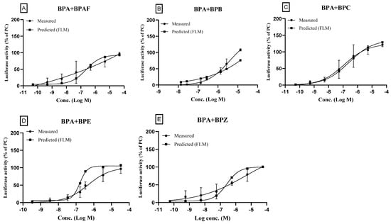 The binary mixtures of BPA and other agonistic bisphenol compounds (BPAF, BPB, BPC, BPE, and BPZ), were prepared by mixing equi-effect concentrations as described in the methods section and agonistic effects of the binary mixtures were assayed. The results were compared to the predicted data obtained using FLM. The concentration–response curves of the binary mixtures (both the measured and the predicted values) are shown in Figure 4. As shown in the figures, the ERα transactivation increased as the mixture concentration increased both in the measured and predicted data. Furthermore, patterns of concentration–response curves of the measured and the predicted were very similar. The measured curves were very close to the predicted curves, respectively, which did not expect synergism or antagonism.