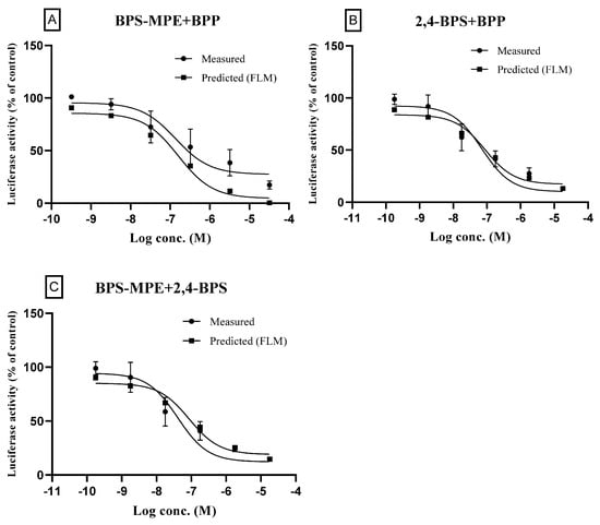 The binary mixtures were prepared by mixing two compounds with an equi-effect ratio of IC50 as described in the methods section. Three mixtures were prepared: BPS-MPE/BPP, 2,4-BPS/BPP, and BPS-MPE/2,4-BPS. The highest test concentration of the binary mixture was based on the IC50 of each compound, and the concentration was serially diluted. Test wells were spiked with 25 pM 17β-estradiol, and the normalized mean values of the luminescence signal (luciferase activity) of the test wells were divided by that of spiked control (100%). Concentration–response curves of binary mixtures of the antagonist compounds, both the measured and the predicted, are shown in Figure 5. As shown in the figure, the measured curves were very close to the predicted curves, respectively, which did not expect the synergism or antagonism. When the parameters of the concentration–response curves were calculated, they were also very similar as shown in Table 5. The MDRs, calculated as the ratio of the expected values and the measured values in the test concentrations, were within 0.50~2.00 indicating additive activity.