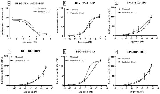 A mixture of three antagonists (BPP, BPS-MPE, and 2,4-BPS) was prepared and tested for the antagonistic effects on ERα transactivation activated by 25 pM 17β-estradiol. As described in the methods section, the highest test concentration of the ternary mixture for antagonist assay was based on the sum of IC50 of respective individual compounds. The mixture of three antagonists (BPS-MPE, 2,4-BPS, and BPP) also showed an antagonistic effect as shown in Figure 6A. Five ternary mixtures prepared by combining six agonists (BPA, BPAF, BPB, BPC, BPE, and BPZ) were tested for the agonistic effect on ERα transactivation. The highest test concentration of the ternary mixture for agonist assay was based on the EC50s of the respective individual three compounds. The results are shown in Figure 6B–F. Similarly to the binary mixtures, the concentration–response parameters of ternary mixtures also showed similarity between the measured and the predicted results, as shown in Table 6.