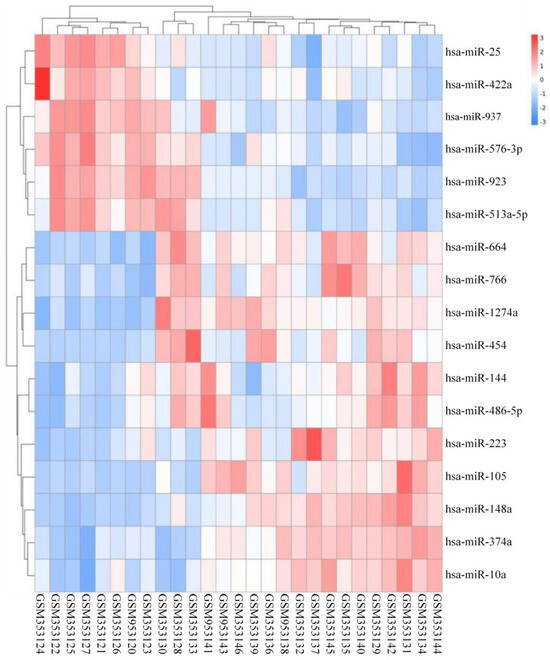 By analyzing the differential expression profiles of the samples from the subjects in the COPD and control groups, miRNAs with differential expression were screened. To be specific, 99 (64↓ vs. 35↑), 17 (11↓ vs. 6↑), and 53 (22↓ vs. 31↑) miRNAs with differential expression were screened from GSE61741, GSE38974, and GSE136390, respectively (Tables S1–S3). Volcano maps (Figure 1, Figure 2 and Figure 3) and heat maps (Figure 4, Figure 5 and Figure 6) showed that the screened miRNAs with differential expression had relatively good discrimination between the COPD group and the normal group.